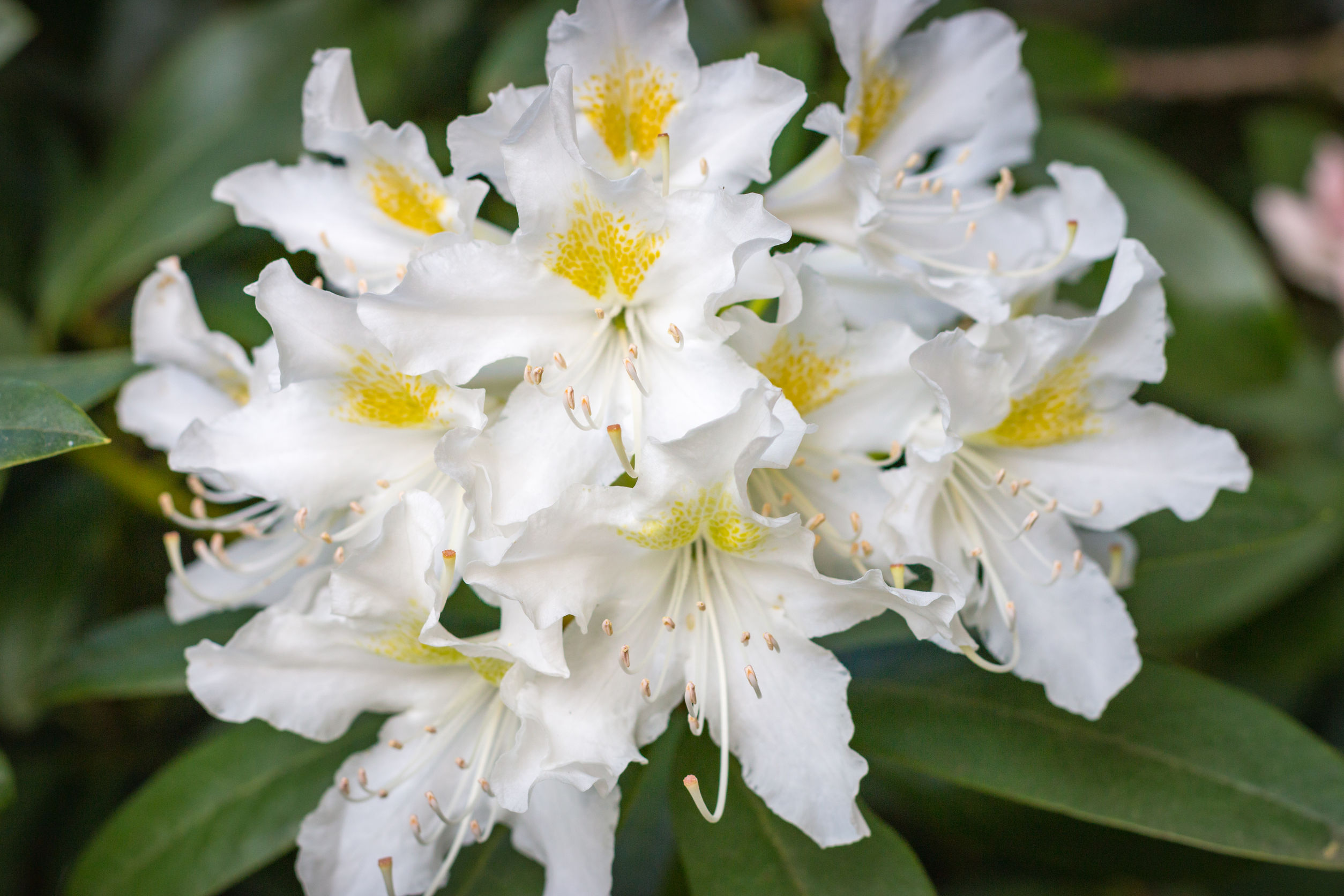 Rhododendron ‘Cunningham’s White’ bloeit met witte bloemen in de maanden maart tot en met mei. De bladeren zijn groen van kleur en deze is bladhoudend.